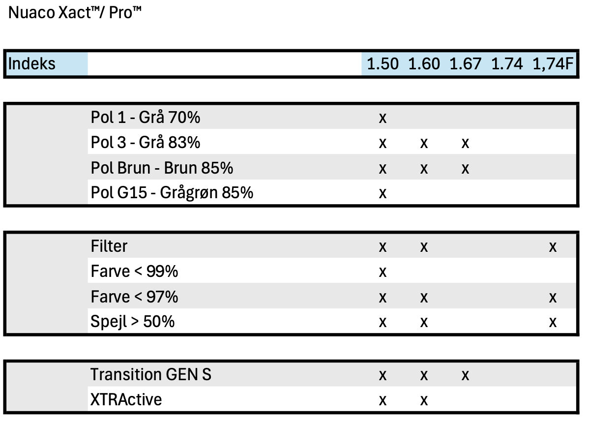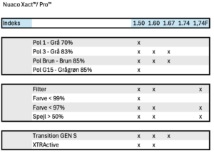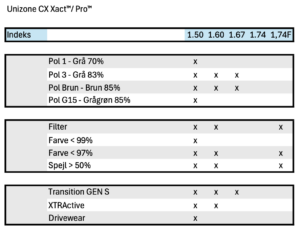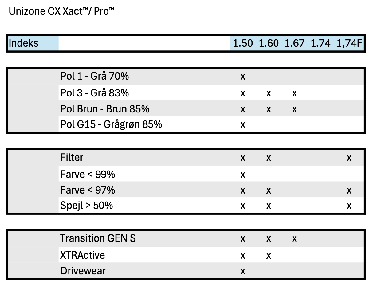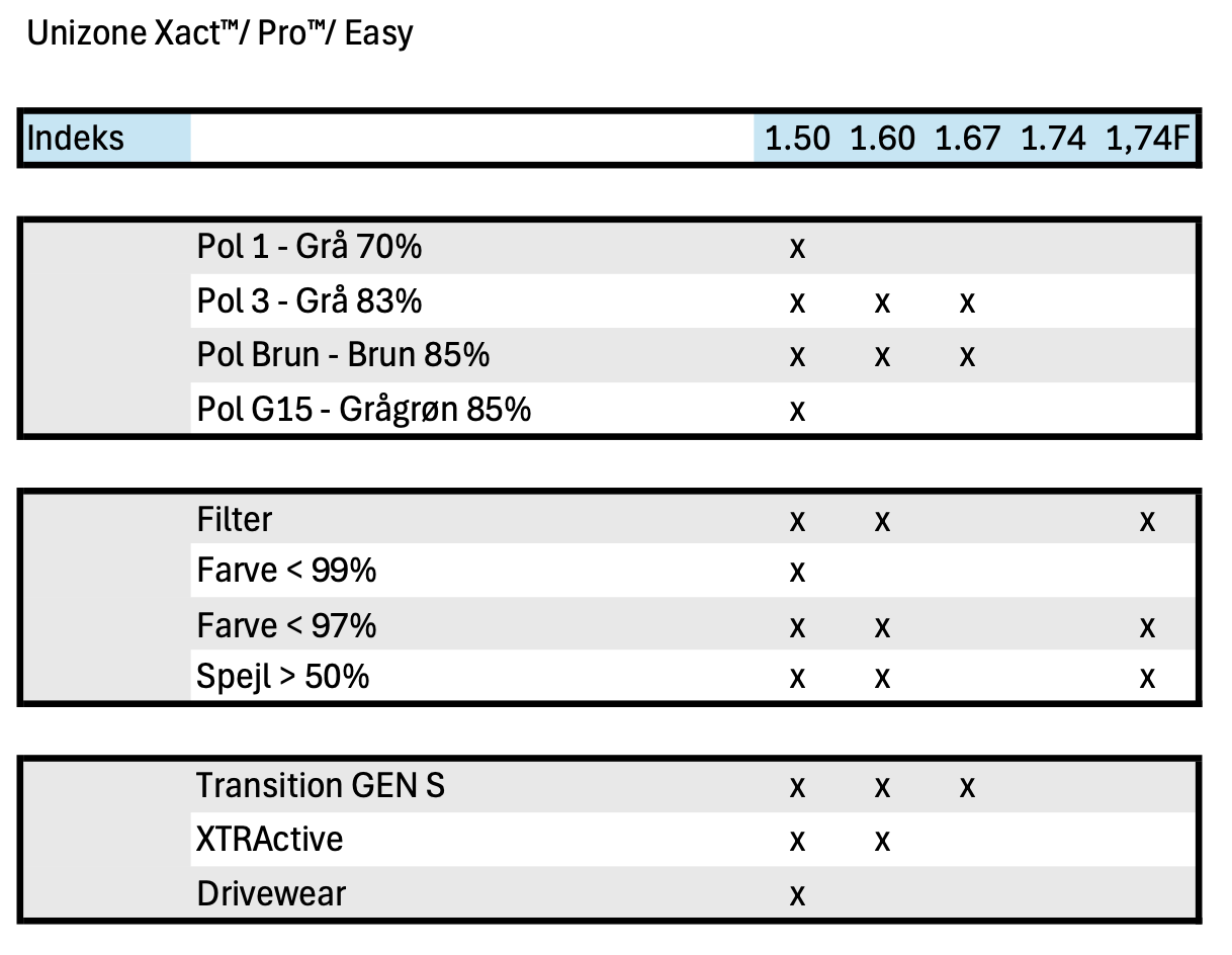 Meget individualiseret progressivt design, skabt med high-end fri form teknologi. Effekter kompenseres i forhold til stellets krumning, hvilket er ekstra vigtigt, hvis stellet er mere buet/tiltet end et standardstel. Dette design er nu også opdateret med prismekompensation. For UniZone Xact skal følgende parametre angives: PD, højde, boksværdier, Panto, Z-tilt og BVD.