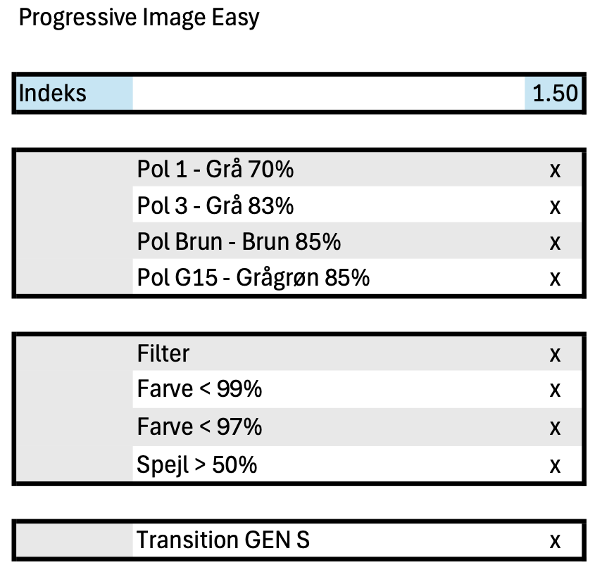 Et traditionelt progressivt forsideglas med sfærisk design. God balance mellem afstand og nær. Store muligheder for at skabe høje styrker, stærke prismer, slab-off evt. i indeks 1,5.