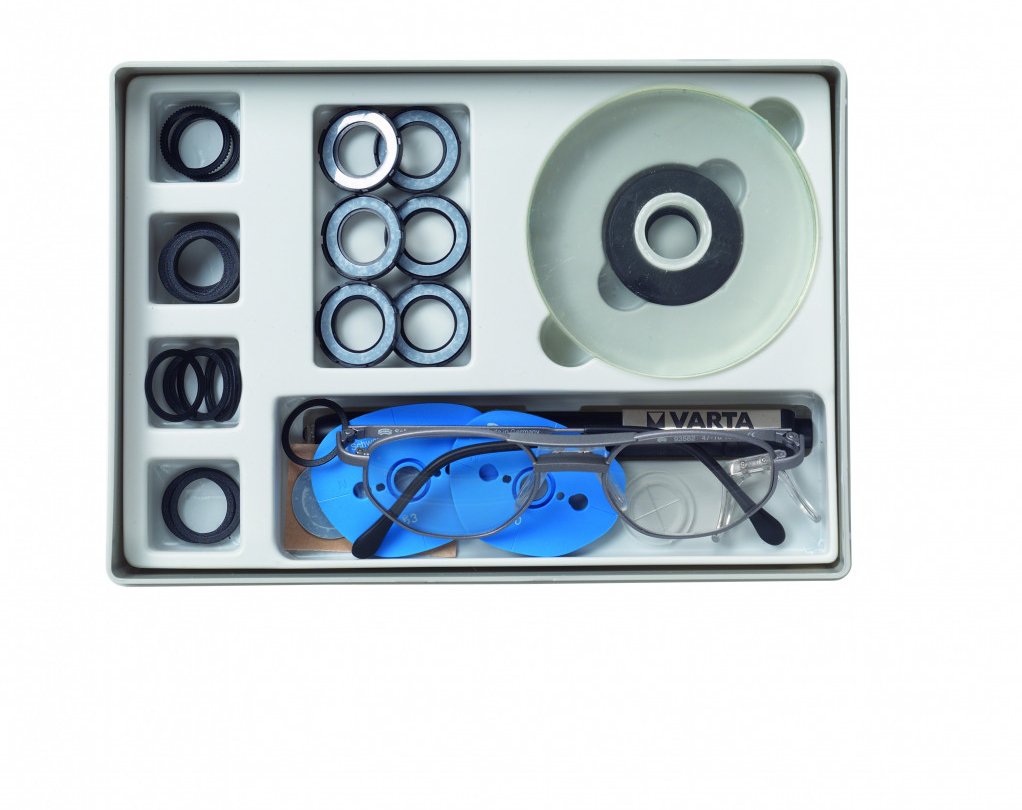 Denne boks indeholder alle monteringsdele, der kræves til montering af et teleskop i et brillestel: prøvestel adaptere, monteringsværktøj til låsering, monteringsglas med og uden monteringshul lavet af CR39 (3 stk. hver), skivesæt, adaptere til korr. glas, ekstra låseringe, penlight, titanium teleskopiske brillestel.